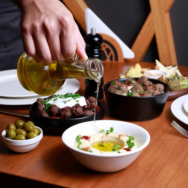 في مطعمنا ، نفخر بتقديم مجموعة واسعة من الأطباق من المأكولات اللبنانية والمتوسطية والعربية والشرق أوسطية. وضعت القائمة لدينا بعناية لتوفير تجربة طعام أصيلة ولذيذ لضيوفنا. بالإضافة إلى مجموعتنا المتنوعة من الأطباق, نحن أيضا نلبي احتياجات أولئك الذين يبحثون عن خيارات الحلال. نحن نتفهم أهمية تقديم وجبات تتوافق مع متطلبات غذائية محددة ، وفريقنا مكرس لضمان أن يتمكن الجميع من الاستمتاع بوجبة لذيذة في مؤسستنا. سواء كنت تتوق إلى المقبلات اللبنانية التقليدية ، أو كباب البحر الأبيض المتوسط اللذيذ ، أو اليخنات العربية العطرية ، فلدينا ما يرضي كل الأذواق. نحن ندعوك للانضمام إلينا لتجربة طعام لا تنسى مليئة بالنكهات الاستثنائية والضيافة الدافئة.